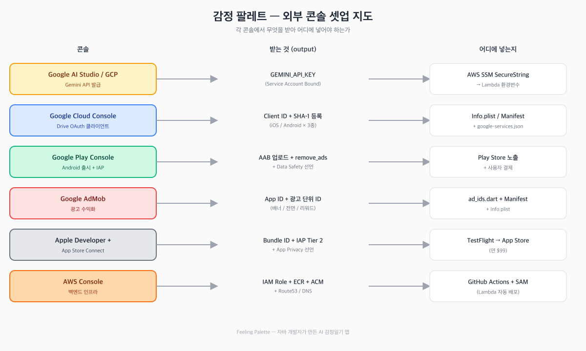 소스: github 저장소 링크 (TODO: 발행 시 채우기)1편에서 3편까지 코드와 인프라 이야기를 했습니다. 마지막은 한 발짝 떨어져서 보는 시야 — "이 앱을 실제로 출시하려면 외부 콘솔 6개를 어떻게 셋업해야 하는가" 입니다. 처음 출시하면 이 콘솔들을 들락날락하다가 자기가 어디에서 뭘 했는지 잊어버리기 십상이라, 한 장의 지도가 필요합니다.